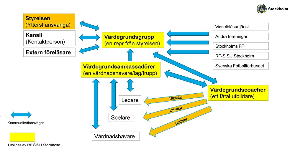 Föreningen har ett Värdegrundsråd (föreningens värdegrundsgrupp) som består av en från styrelsen, en med föräldraperspektiv och en från sporten. Gruppens sammankallande är en så kallad värdegrundsansvarig som. Tillsammans ska rådet ses en gång i månaden för att ta beslut i ärenden, arrangera utbildningar, kalla det till möten med föreningens värdegrunds-ledare (föreningens värdegrundsambassadörer) och kommunicera ut detta i föreningens kanaler. Värdegrundsrådet ska följa idrottens värdegrundsarbete och har föreningens styrelse och föreningens policys till sin hjälp för att ta beslut i frågor som berör enskilda medlemmar.