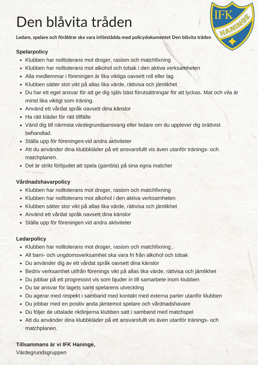 Medlemmar i IFK Haningen skall följa dessa policys.